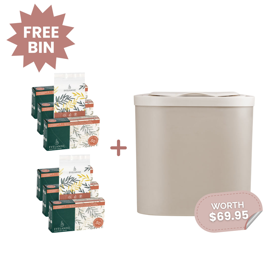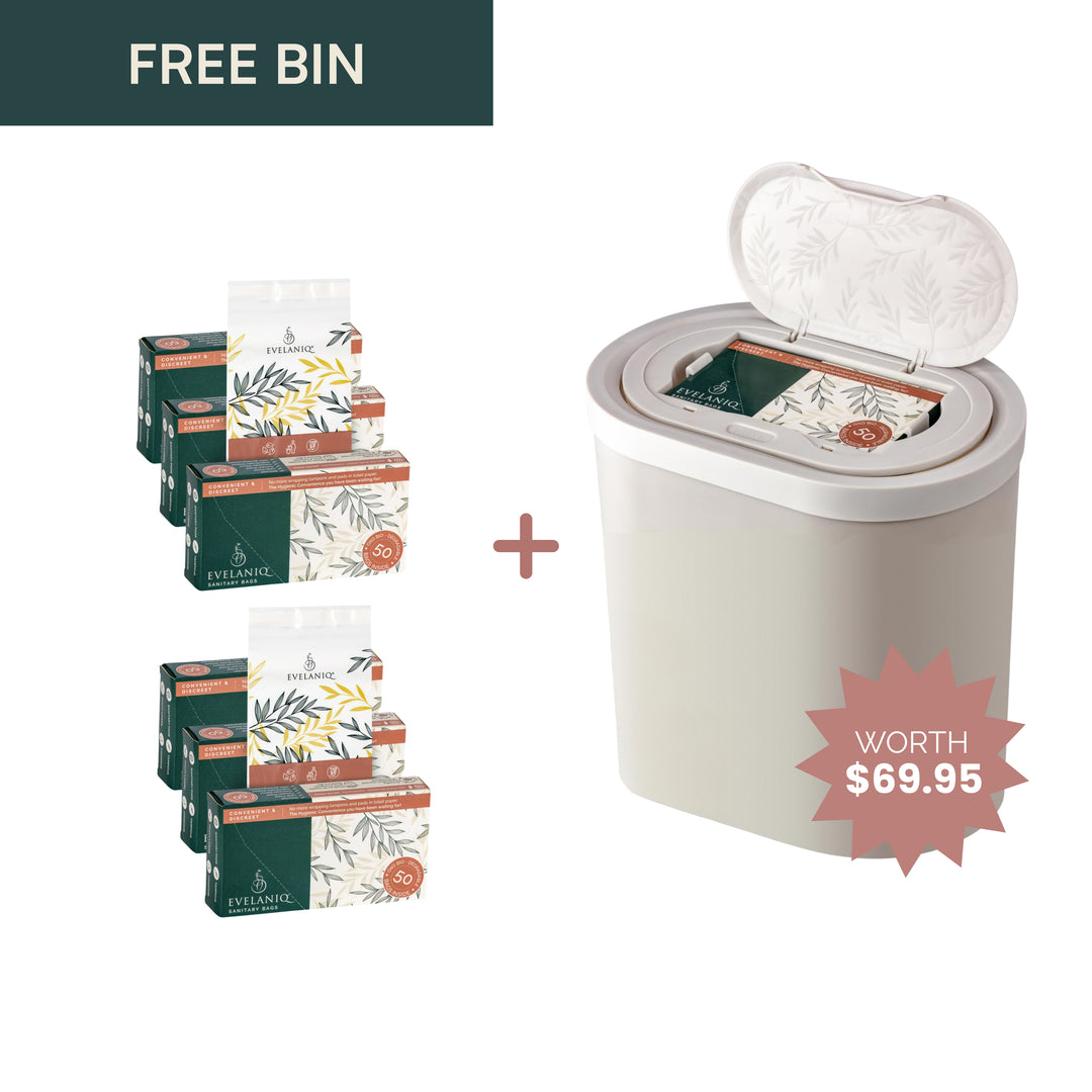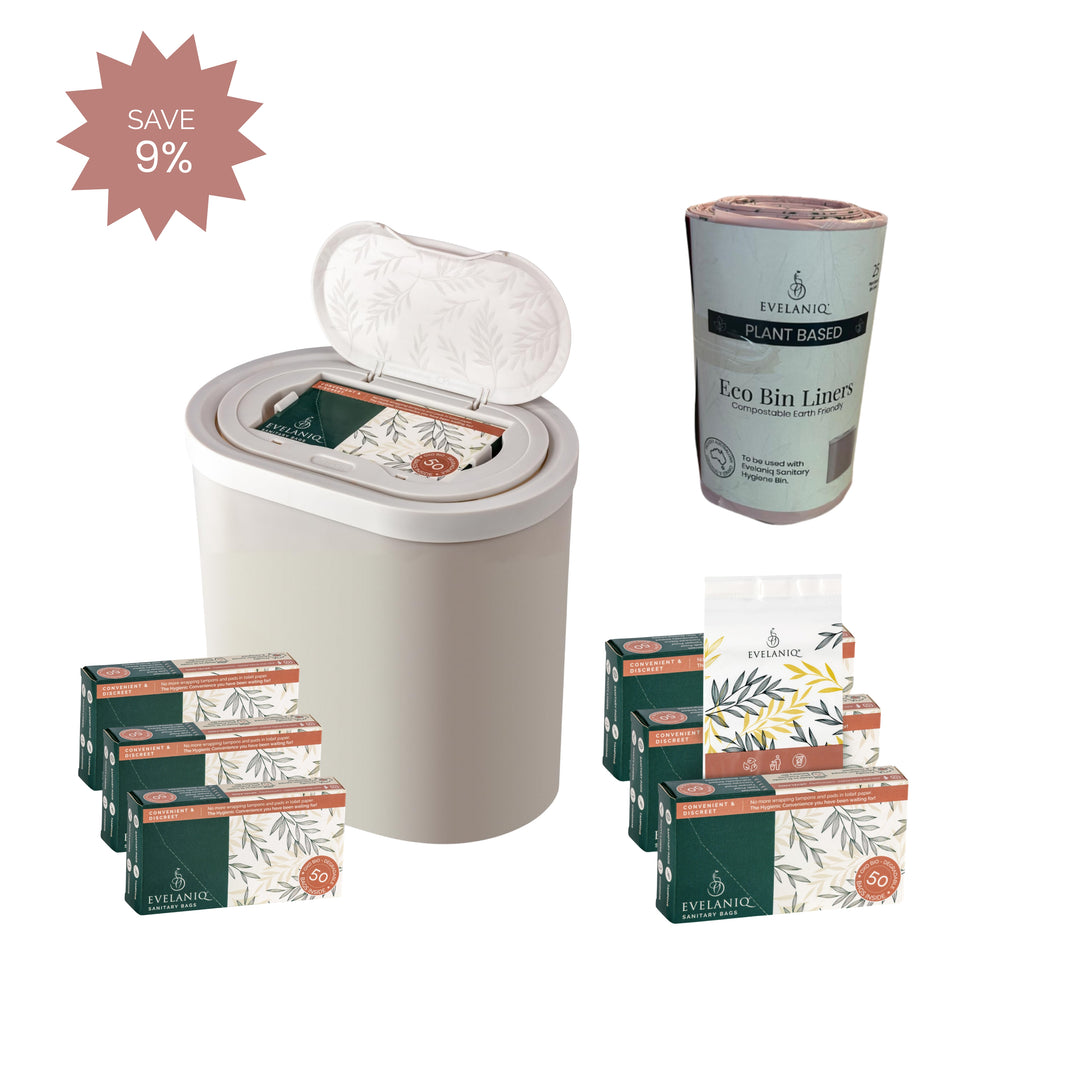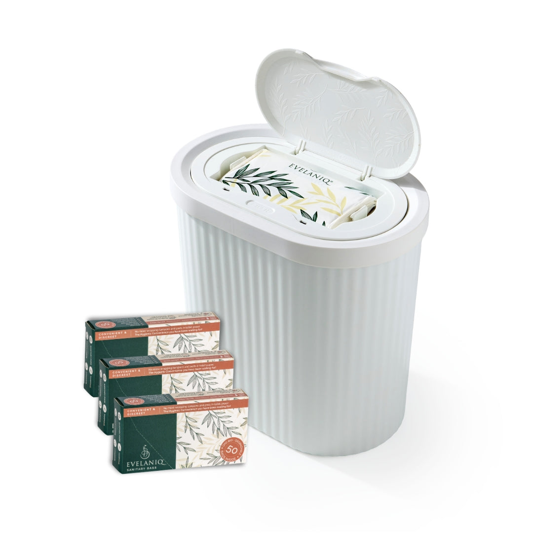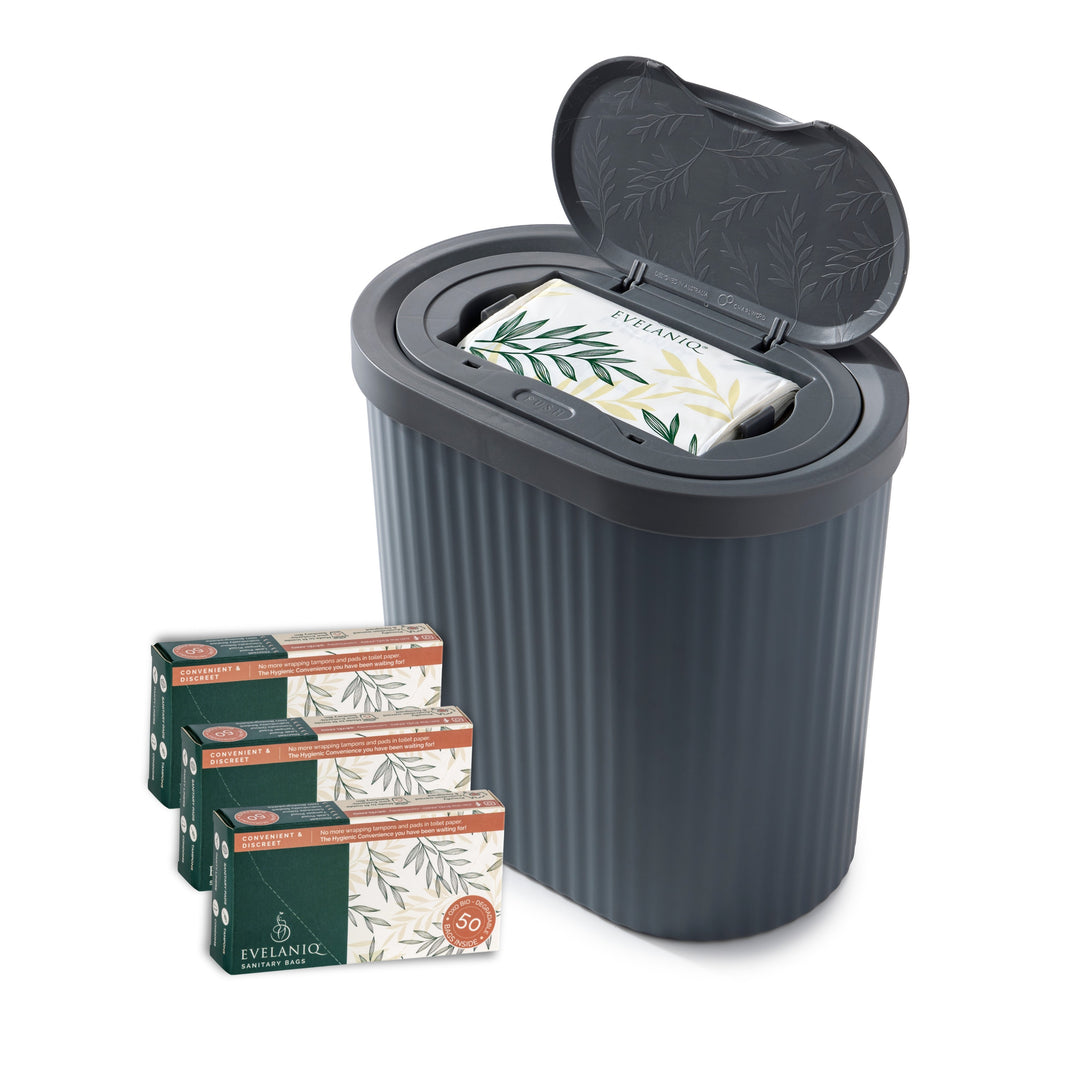 Evelaniq is an all-in-one, hygienic disposal unit that is compact, convenient and discreet. Biodegradable bags are stowed neatly inside the lid to dispose of pads, tampons and condoms individually. The Evelaniq Sanitary System replaces your every day bathroom bin. No more odours or leaking, smelly pads and tampons. Hygienic convenience for everybody, everyday!