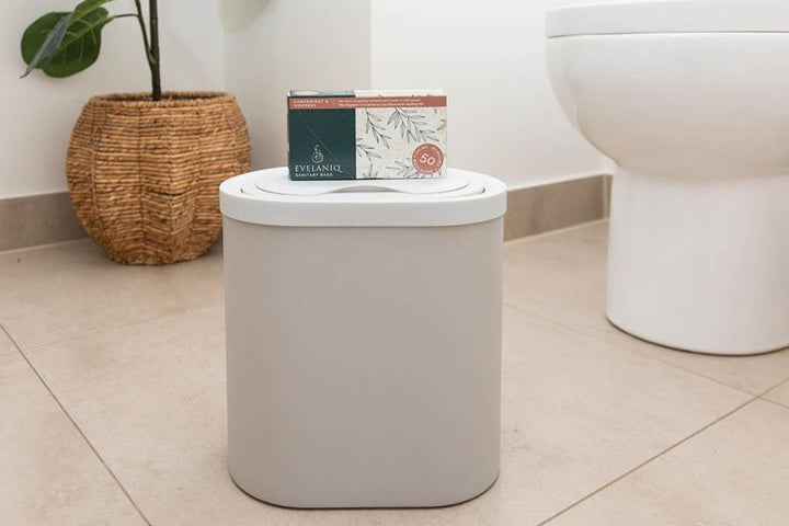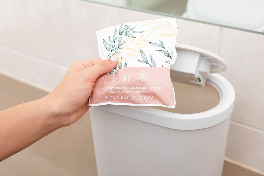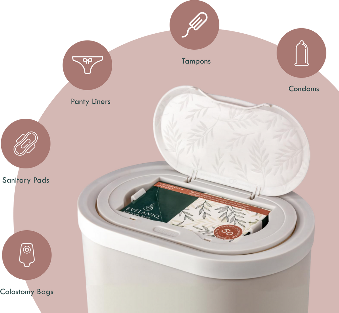 Evelaniq isn’t just a bin — it’s a complete sanitary disposal system. Our patented design combines odor-locking technology, a built-in biodegradable bag dispenser, and discreet waste storage. It keeps your bathroom or workplace fresh, hygienic, and completely odor-free — no daily emptying, no embarrassment, no smell.